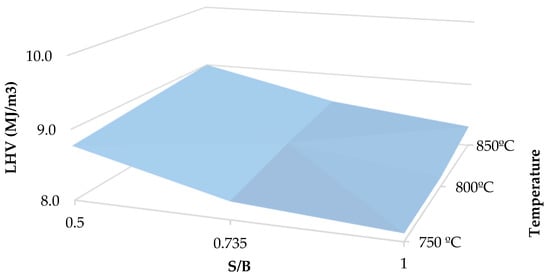 Figure 8 presents the lower heating value of the produced gas as a function of S/B and temperature calculated according to Equation (1).