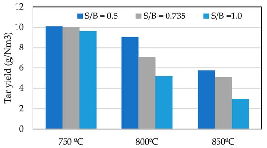 The increase of the S/B ratio promotes decreased tar content, which is attributed to steam reforming of the tar []. High temperature favors destruction and reforming of tar, leading to a decrease in tar content []. Tar yields obtained by steam gasification of BSG in this work are not dissimilar from those obtained from other biomasses []. Nevertheless, it would require cleaning before it can be used on downstream equipment since it is beyond the general acceptable limits [].