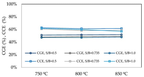 Figure 10 describes the effect of gasification temperature as well as S/B ratio on CCE and CGE.