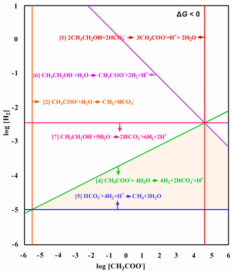 The opportunity window of thermodynamics for different metabolic pathways involved in methane production from ethanol with concentrations of acetate and hydrogen as thermodynamic constraints. The orange area represents route 4, containing reactions 6, 4, and 5, i.e., the bioconversion of ethanol to acetate and hydrogen, linked with syntrophic acetate oxidation and hydrogenotrophic methanogenesis.