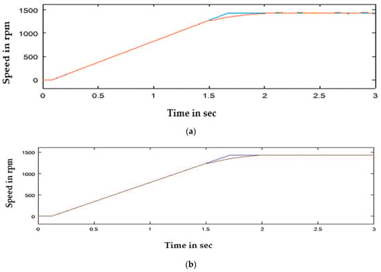 Speed response of proposed sensorless induction motor drive under normal running conditions using Extended Kalman filter: (a) induction motor 1 and (b) induction motor 2.