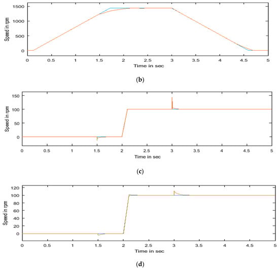 Speed response of inverter-fed induction motor under parameter variations using a conventional space vector modulation-based induction motor drive with a speed sensor: (a) change in stator resistance, (b) change in rotor resistance, (c) low speed, and (d) low inertia.