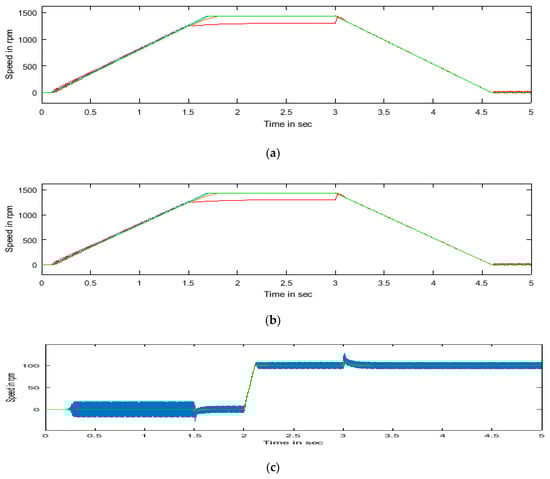 The speed guesstimation using the Luenberger observer method is executed in MATLAB software. This is illustrated in Figure 6. The speed response from the speed estimation using a Luenberger observer results in a small steady state error of 9 rpm, and the settling time took more than 2 s, which is high compared to all other methods.