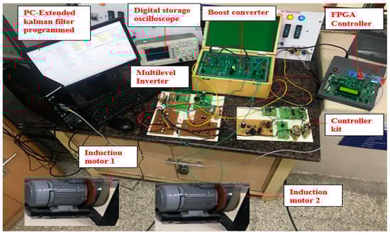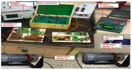 The performance acquired in the simulation is analysed experimentally in hardware setup also. The hardware setup for the sensor-based induction motor drive shown in Figure 16. The no-load test is performed on two motors connected in parallel. It is observed that the size and cost of the device are high. Thus, variable speed control becomes very difficult for this condition. The above-mentioned difficulties have been rectified in this proposed sensorless drive. The hardware setup for the sensorless drive is illustrated in Figure 17. Twenty-five percent of the size and cost of the system has been reduced in the proposed method.