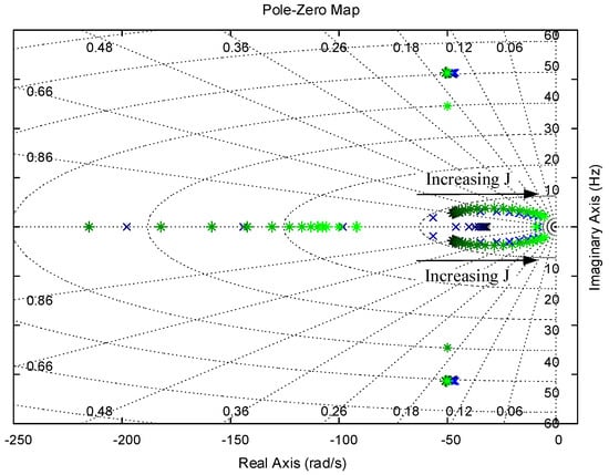 The impact of J (increased from 0.06 to 6) and the introduced current lowpass filters on the poles distribution of synchronverter system. Cross: poles without current lowpass filters. Asterisk: poles with current lowpass filters.