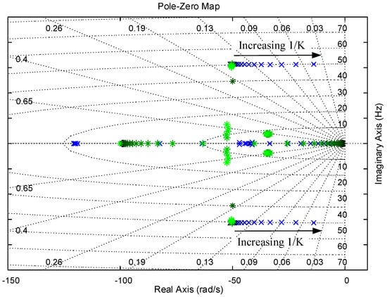 The impact of 1/K (increased from 0.075 to 7.5) and the introduced current lowpass filters on the poles distribution of synchronverter system. Cross: poles without current lowpass filters. Asterisk: poles with current lowpass filters.