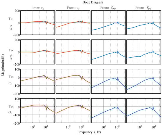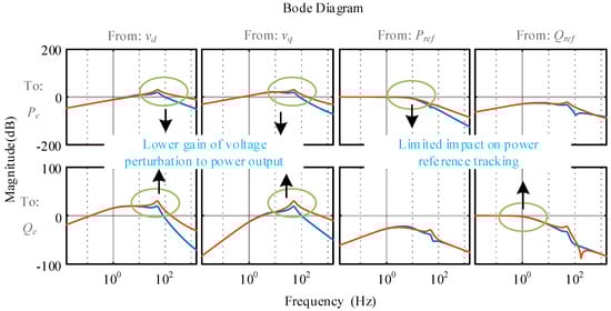 The comparison of bode diagrams of both the conventional and modified synchronverter are illustrated in Figure 7 according to (12) and (26). The red line in Figure 7 is the bode diagram of conventional synchronverter and it’s observed that the magnitude of transfer function from [vd, vq]T to at 100 Hz is much higher than 0 dB. It means that the negative sequence component in unbalanced grid voltage will be amplified in the control system and finally results in large negative sequence output current. The resonant controllers enable the synchronverter to have current reference tracking capability at 100 Hz in synchronous reference frame because of the unity gain of the transfer function from to at 100 Hz. After adding resonant controllers, the magnitude of the transfer function from [vd, vq]T to at 100 Hz reduces significantly. This verifies the effectiveness of proposed negative sequence current suppression strategy using a resonant controller. In addition, the magnitude of transfer function from [vd, vq]T to at 100 Hz also reduces significantly, which means that the double frequency power ripples can also be reduced by using resonant controller.