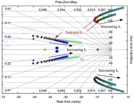 As the resonant controller has a wide resonance peak against frequency variation, the impact of resonant controller to the system stability needs to be considered, and the resonant controller gain kr needs to be designed properly. According to the analyses of power control loop demonstrated in Section 2.2, the parameters D, J, 1/K are chosen as 100, 0.6, 0.75, respectively, and the bandwidth of resonant controller is chosen as 10 rad/s. In order to investigate the influence of the parameter kr to the stability of the control system, the pole-zero map of the modified synchronverter with different kr is shown in Figure 8 according to Equation (26). In addition, to verify the effectiveness of the proposed filter based power ripple elimination method in unbalanced power grid, the results with and without the current lowpass filters are shown as blue asterisk and green cross, respectively.