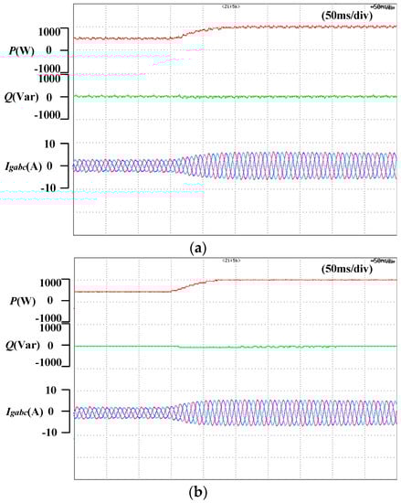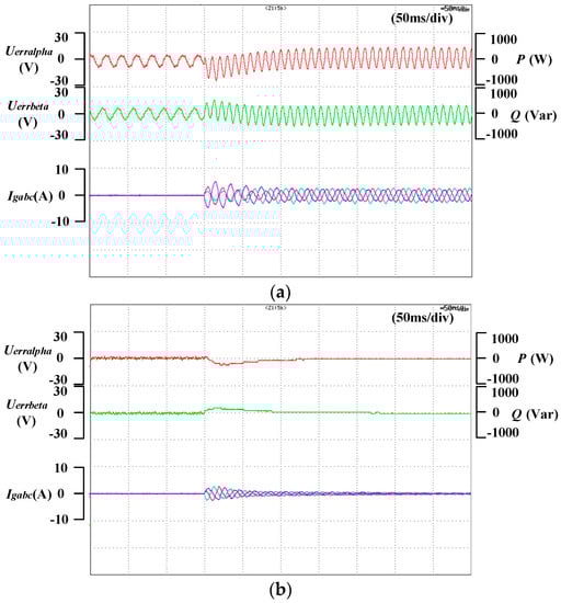 Before the grid connection, the voltage errors between the grid and converter voltages are shown in and axes separately. And the voltage errors are changed to active and reactive powers when the switch is closed to show the dynamic response of the powers. The voltage errors contain ripples in the conventional synchronverter as shown in Figure 10a, which means that the synchronization is not precise. Thus, the currents are very large when the switch is closed. Compared with the conventional synchronverter, the voltage errors are effectively limited in the proposed synchronverter as shown in Figure 10b. In addition, the grid currents are smaller and damped much faster after the switch is closed. Therefore, the converter can be connected to the grid more smoothly when the proposed synchronverter is used in an unbalanced power grid.