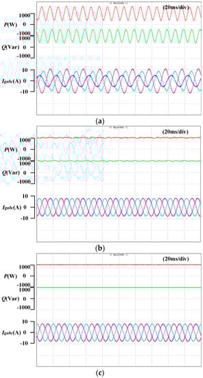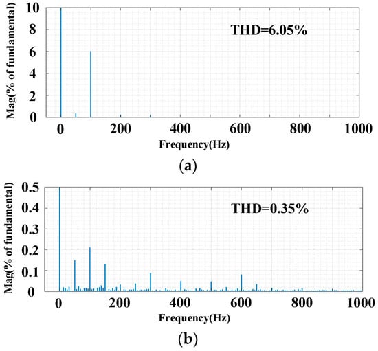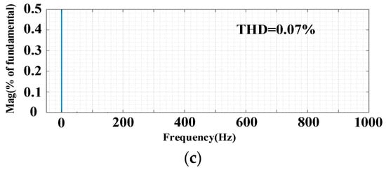 Compared with Figure 11b, the proposed synchronverter with filter in Figure 11c can further reduce the power ripples. It can be observed in Figure 13b that the power ripple components are mainly concentrated on the multiples of the 50 Hz, which coincides with the theoretical analyses. And the power ripples can be eliminated as shown in Figure 13c, which verifies the effectiveness of the proposed power ripple elimination method.