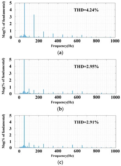 Grid currents THD analyses. (a) Conventional synchronverter. (b) Proposed synchronverter without filter. (c) Proposed synchronverter with filter.