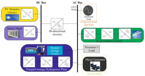 The underlying hybrid architecture, interconnected with the grid, combining the generation technologies (PV-wind-PSH-diesel) and the storage unit mentioned above, is illustrated in Figure 1. An advantage of this architecture is the plug-and-play operation, where wind, hydropower and diesel generation units are coupled directly to the AC Bus. The storage unit (battery bank) and the PV generation are coupled to a DC bus, through proper DC/DC converters, which is then sequentially coupled to the AC bus through a bidirectional DC/AC, thus allowing a two-way (flow between the two busbars) power flow. The diesel generator will play a reserve role, i.e., its primary state is off, only on shut down situations will be turned one, otherwise the grid exchanges will provide existing shortages.