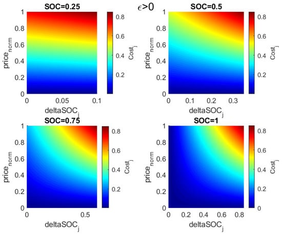 To better highlight the codomain of this cost function, Figure 2 is introduced, where four different initial SOCs are considered for an energy deficit situation (where a discharge of the storage technologies is expected). The chosen SOCs, were the upper limit, i.e., SOC = 1, followed by two intermediate levels (equally spaced), i.e., SOC = 0.5 and SOC = 0.75 and a near border limit of SOC = 0.85.