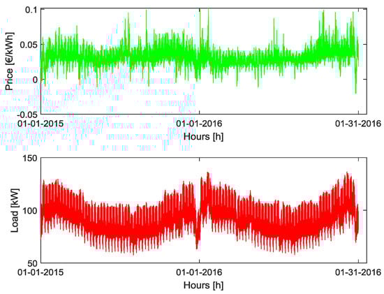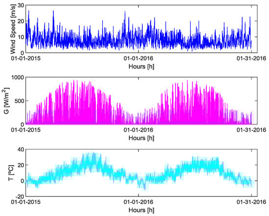 For simulation purposes, it was necessary to use a nationwide database, which included not only all the parameters required to model the different HES sources, but also the vital information (explanatory/exogenous variables) for the successful implementation of a 24-h electricity prices forecasting in a real market context. To serve this purpose, the open power system data [29] was used. This online platform compiles national/system level data from several sources, not only containing common time-series data (load, prices and renewable generation and its respective forecasts, etc.), but also the important weather data (solar irradiation, temperature and windspeed). Thus, to include all the necessary simulation variables (used both in price prediction and in HES modeling), only a handful of countries provide all the necessary data on an hourly basis. In this sense, the data regarding the Czech Republic (CZ) system for the period from 1 January 2015 until 31 December 2016 was used. Furthermore, the annual average diesel prices for Czech Republic were also used to representatively model the diesel generator operation cost [30]. Nevertheless, some processing of these raw data is still necessary, starting with the necessary electric load adjustment, since the average CZ system load value is about 7343 MW, then a reducing scale factor is applied to bring the load to an average value around 100 kW (prosumer level). Secondly, since the wind speed is the result of average anemometers measurements across the country, its average value is around 3.93 m/s, which following the Wind Energy Resource Atlas of the United States for a height of 10 m placing it in the lowest class of wind power potential (class 1) and well below the majority of the wind turbines cut-in speed, when viable wind farming sites usually present values higher than 6 m/s. So, therefore, a scaling factor of 3 is applied to the existing wind profile to simulate more favorable conditions, as is customary in wind farm sites. In the same manner, a minor adjustment is applied to the irradiance levels, in order to better replicate more consistently the existing conditions in photovoltaic parks.