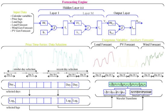 In addition, the FFNN input layer is completed with a set of exogenous variables, including calendar variables (hour, season, weekday and binary holiday indexes), lagged load and renewable generation, as well as load and renewable generation estimates (i.e., with the same time horizon for which the price forecast is made).