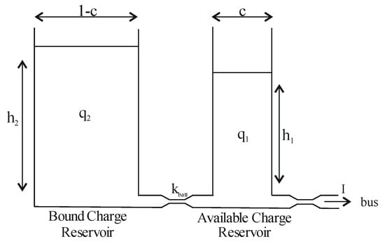 KiBaM models the total capacity of a battery in two reservoirs, separated by a conductance, as illustrated in Figure 6. The available charge reservoir contains a fraction of the total (nominal) capacity qmax (expressed by q1), responsible for the immediate supply of energy to the connected load. The bound charge reservoir has a fraction of the total capacity (expressed by q2) and is responsible for supplying energy exclusively to the available charge reservoir. The rate of charge flow between reservoirs depends on the conductance parameter , as well as the difference between the two reservoirs height , with and . After periods of battery discharge/charge the reservoirs tend to balance, i.e., .