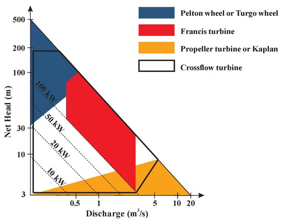 A Francis turbine is a good fit for energy demanding appliances. For this HES a mini hydropower application (<1 MW) is considered, feasible with low to medium head resources with relatively small dams, as Figure 7 reveals. China has exploited these mature small-scale ranges better than anyone else [55], proving the effectiveness of these technologies, leading the charts with around 200 GW of installed hydropower capacity.