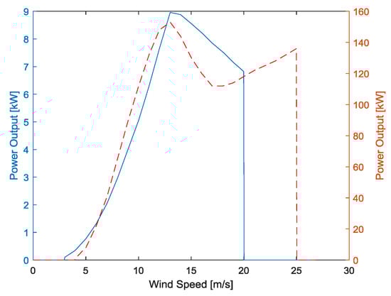 In order to perform the wind speed mapping to turbine’s output power , the authors used the approximated power curves provided by the manufacturers, as depicted in Figure 8, despite the existence of linear, nonlinear and physical approximated models [1,51,58,59,60]. In this paper, the adopted wind energy conversion system fell on a combination of Bergey BWC Excel-10 and Norwin 24-STALL-150 kW turbines, in order to a total an exact amount of 200 kW of installed capacity.