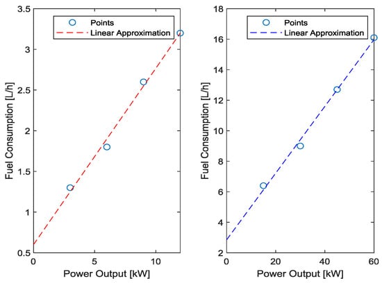 where stands for the fuel curve intercept coefficient, for the rated capacity of the generator, is the fuel curve slope and the generator power output. In this context, two diesel generators with a rated power, , more suitable for large energy deficits and one diesel generator with a rated power for small deviations were integrated on the HES portfolio. To calculate the equation parameters, the approximate fuel consumption data at ¼, ½, ¾ and full load of real generators were used, as illustrated in Figure 9, with the constant parameters defined as: and for the 60 kW generator, and and for the 12 kW generator.