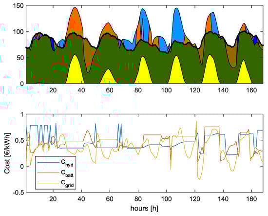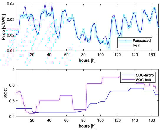 The marginal costs of the non-dispatchable generation are considered null. Regarding the grid cost, the same is computed as a function of the state of charge, SOCj, and the electricity price forecast (predicted value , predicted daily average and maximum predicted value) and is given by Equation (1). This cost was also defined as a piecewise function where each sub-function is defined over an interval formed by the signal of and . The inclusion of the electricity price forecast information on the formulation allows to gauge the future trend of electric energy prices, which is of high interest for a player with this type of generation mix. Since it allows to dispatch the stored energy when high electricity prices are expected and, on the opposite, to take advantage of off-peak periods for storing energy when lower electricity prices are expected.