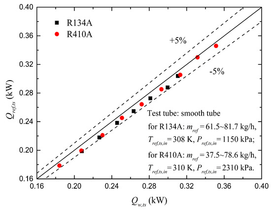 To evaluate the heat insulation of the entire test section, two single-phase tests were performed to investigate heat loss using R134A and R410A. Figure 3 illustrates the results of single-phase heat balance measurements for the test section. It can be seen that the deviations between the water-side heat flow rate (Qw,ts) and refrigerant-side heat flow rate (Qref,ts) are lower than 5%. This ensures that the heat loss in the experimental apparatus can be neglected, due to its insignificant influence on the flow boiling heat transfer.