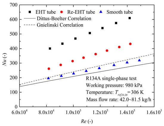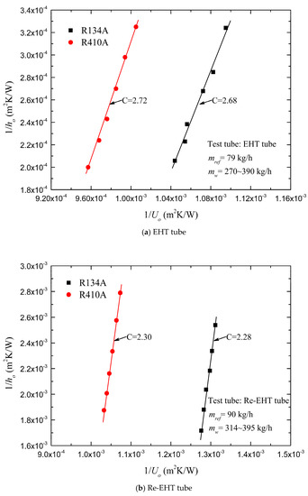 As depicted in Figure 4, the Wilson plot tests were done using the data points of refrigerants R134A and R410A. The water-side heat transfer enhancement factor C can be calculated directly by applying a linear regression method. It is found that the term C is only related to the special surface structures, and does not depend on the working fluid. According to the experimental results, the appropriate value of C is 2.70 for the EHT tube and 2.29 for the Re-EHT tube. This heat transfer enhancement is attributed to the dimples/protrusions on the tube wall. Something else to note is that all thermodynamic properties of R134A and R410A were obtained from REFPROP 9.1 software [26].