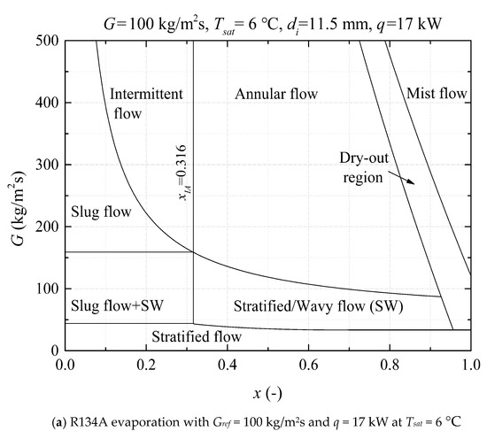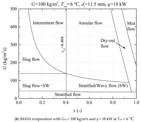 The Wojtan et al. [29] flow pattern map has been widely used for boiling flow heat transfer in horizontal smooth tubes. Figure 6 shows the predicted flow pattern in this study for R134A and R410A, at Gref = 100 kg/m2s, Tsat = 6 °C, and di = 11.5 mm. Obviously, it can be inferred that the main flow regimes are slug flow, stratified-wavy flow, intermittent flow, and annular flow. In the smooth tube tested, the flow patterns are the slug flow and stratified-wavy flow, using R134A and R410A as the working fluid at low mass fluxes. When Gref > 150 kg/m2s, the intermittent low and annular flow will occur according to the flow pattern map in the vapor quality range of 0.2–0.8. The local dry-out could appear as the mass velocity and vapor quality increases, when Gref > 200 kg/m2s and x > 0.9. Similar to the results reported in [4,16,29], evaporating coefficients tend to decrease with the increment of the vapor quality. For the boiling heat transfer process, nucleate boiling is dominant in the low-quality region, while the contribution of convective boiling increases as the mass velocity increases. Intermittent and annular flow patterns are usually considered as the optimal heat transfer patterns due to the smaller internal thermal resistance caused by the thin liquid film. The transition vapor quality from intermittent flow to annular flow, xIA, can be determined by the Kattan-Thome model [30] and is given by: