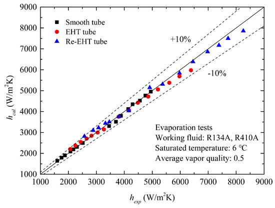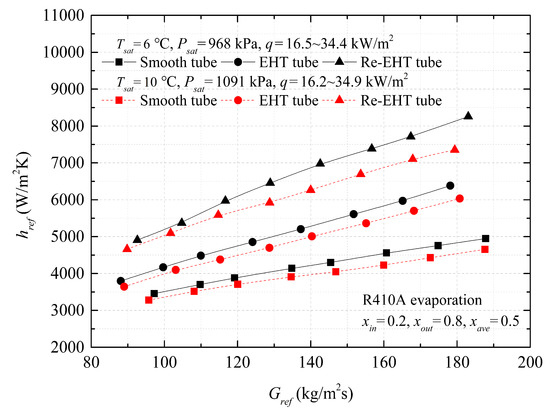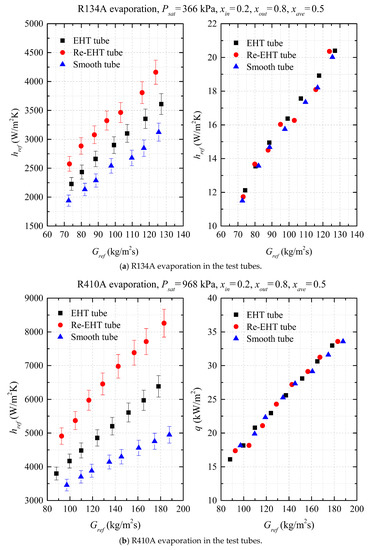 A comparison of evaporation heat transfer coefficients of R410A between the tested enhanced and smooth tubes are shown in Figure 7b. The heat transfer enhancement ratio of the EHT tube to the smooth tube is in the range of 1.15–1.28, and 1.45–1.65 times for the Re-EHT tube. It can be seen from Figure 7 that the measured coefficient of R134A is lower than that of R410A at the same mass flux. This phenomenon can be explained by the fact that the liquid-phase thermal conductivity and latent heat of R410A are larger when compared with R134A. Additionally, R410A has the higher imposed heat flux compared to R134A. Steiner and Taborek [33] used the onset of a nucleate boiling (ONB) criterion to develop a correlation for predicting the minimum heat flux to achieve the ONB during in-tube evaporation: