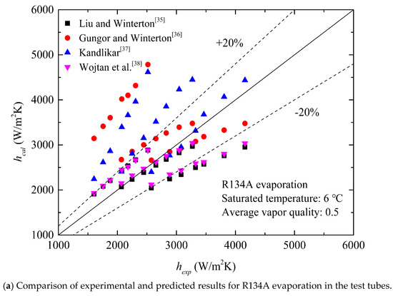 The Gungor and Winterton model [36] tends to over-estimate the experimental results, with a mean absolute error of 42.26% and mean relative error of −45.43%; the Kandilkar correlation [37] also exhibits a larger predictive error. Thus, the Gungor and Winterton correlation [36] and the Kandilkar correlation [37] are not applicable for our experiments. In fact, the refrigerant used in this study is different from those used in the study of Kandilkar [37], where working fluids only include the water, R11, R12, R22, R113, R114, R152, ethylene glycol, and nitrogen. Better agreement can be presented by the prediction correlation of Wojtan et al. [38] and Liu and Winterton [35]. Both of the correlations could predict 80% of experimental data points within a ±30% error band. The Wojtan et al. correlation [38] was built based on the mathematical analysis of the liquid film thickness (δ) and dry-out angle (θdry). The convective boiling heat transfer coefficient (hcb) was developed from the Dittus–Boelter model [28] by replacing Rel and dh with Reδ and δ. The Liu and Winterton correlation [35] was based on the first general model developed by Chen [21] for saturated boiling heat transfer, by considering the force convective term and nucleate boiling term. This correlation is valid for flow boiling heat transfer in channels with the hydraulic diameters in the range from 2.95 to 32 mm.