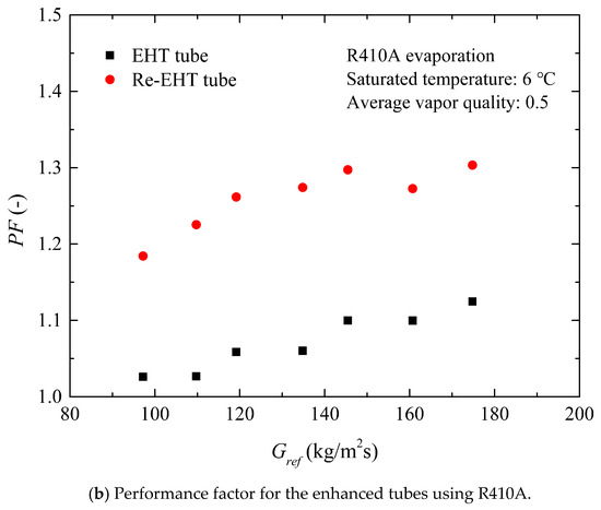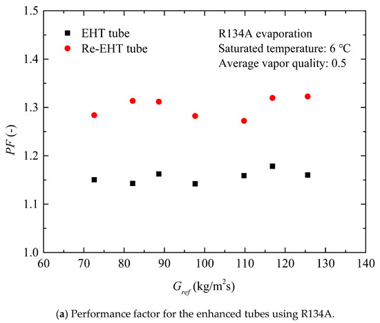 Figure 11a details the variation of the performance factor of R134A during flow boiling in the EHT and Re-EHT tubes with mass flux. Over the entire test range, the PF values of the enhanced tubes are kept steady. The performance factor values are about 15% for the EHT tube and 30% for the Re-EHT tube. Different from the results of R134A case, the PF value of R410A case increases as the mass flux increases at first, and then gradually tends to be flat when Gref > 150 kg/m2s. In summary, the PF values of the EHT and Re-EHT tubes are larger than unity, showing a good heat transfer performance.
