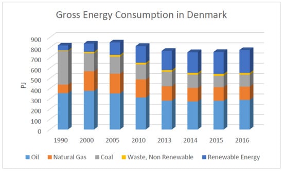 Gross energy consumption in Denmark (data from the Danish Energy Agency).
