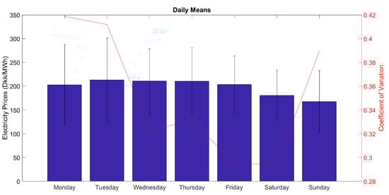 DK west day ahead electricity prices daily means, coefficient of variation, and standard deviation.