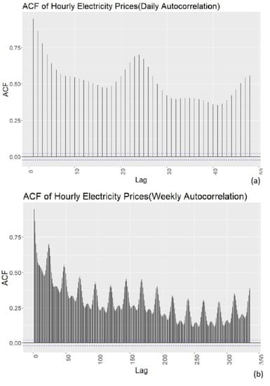 Hourly electricity prices: (a) daily and (b) weekly autocorrelation.