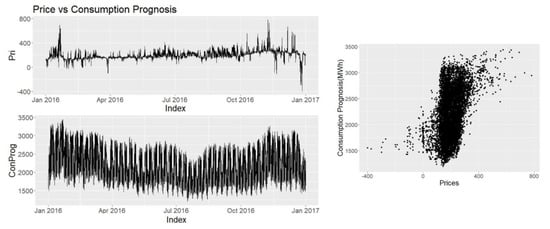 It is seen (Figure 9) that consumption prognosis results in a spiky graph, probably capturing daily, weekly cycles along with the holiday effects. At the end of December, it can be observed that the decrease of consumption prognosis is related to the price decrease. Looking at the scatterplot in Figure 9 it can be observed that consumption has a positive correlation with the price and it is most noticeable at the extremes. Correlation coefficient is CPCP = 0.43, which is significant and much higher than temperature.