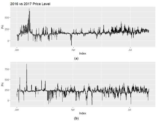 After setting up the model, the input data will be divided into two parts, one for training the model and one for testing the forecasts. The forecasting range will be 24 h with an hourly frequency. To include a full year of training data as a minimum, 2016 data will be taken as the training period. 2017 prices will be forecasted as an expanding forecast for 212 days, which is from the start of January to end of July. Expanding forecast means that after forecasting the next 24 h, that raw data is included to our training period for forecasting the day after. As mentioned by [7,17,18] short and carefully selected test periods do not give any information regarding the performance of the forecasts as they are ignoring special days, holidays and general price variations. Therefore, a 7-month period for forecasting will be used for more objective and better assessment of forecasting models.