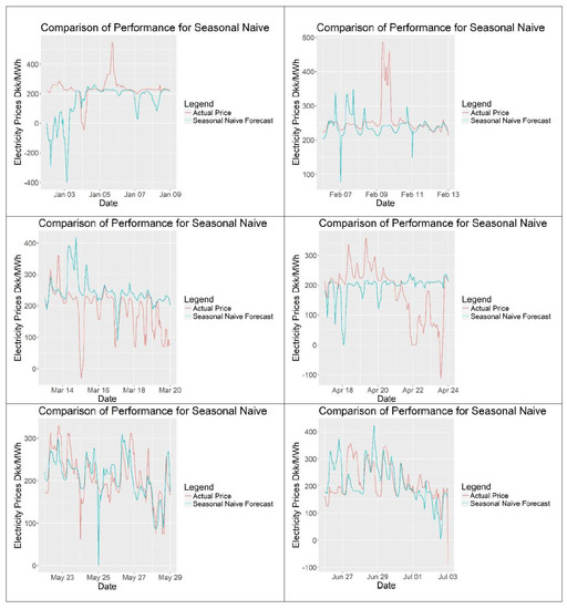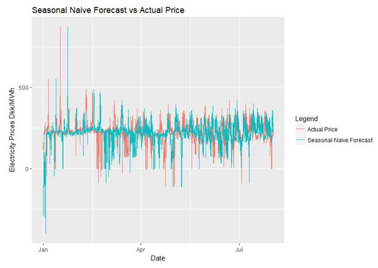 For the evaluation of the forecasts, scaled error models will be preferred over percentage error models as percentage models can yield infinite error when the actual electricity prices are 0 DKK/MWh, making them unreliable. The reader should keep in mind that the performance of the models should only be compared for the same set of data of the same time using the same error calculation model. Also for evaluation simpler forecasting methods can be used as benchmarks. One model that will be used is the seasonal naïve method, which is basically assuming that the price to be forecasted is similar to the previous period’s prices, such as previous week.