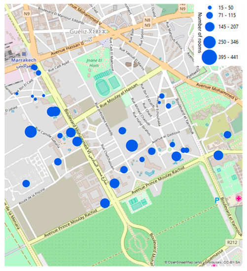 Two potential areas in Marrakech are namely Hivernage and Agdal. Most of the hotel buildings of the city are located in these two neighbourhoods. Since Hivernage hosts more hotels and its situated relatively close to the airport (which can be considered interesting for the future network extension), this neighbourhood is chosen as the area of study for the DC system. The area is situated in the north of Marrakech; in Figure 3, the location of the hotels in the district and room numbers (as an indication of the hotel size) are shown.