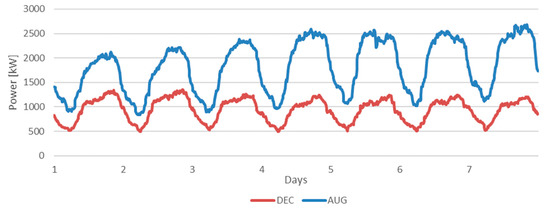 In addition, the hourly electricity consumption profile of available hotels shows a consumption pattern that strictly follows the variation of the external temperature. As an example, the hourly electricity consumption of one hotel in Marrakech in the first week of August 2017 and in the first week of December 2017 is shown in Figure 5. This behaviour confirms the hypothesis of considering the external conditions as the main influencing factor of the cooling demand for our case, although the method does not consider other influencing factors, as described in [29,30]. The peak in the winter is much lower than that in the summer, and occurs during the night-time, while in the summer, the peak occurs close to midday.