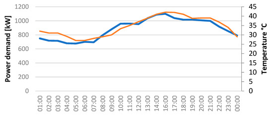 In Figure 6, the variation of the electric power of a hotel building is compared with the variation of hourly outdoor temperature during a typical summer day in Marrakech. It can be clearly seen that the hourly electricity consumption and outdoor temperature follow a very similar trend. However, the peak electric power occurs at around 15:00 when the solar irradiation is more intense, while the highest outdoor temperature is at around 17:00. When the outdoor temperature is near the thermal comfort range, the variation of electric power seems to be negligible. These behaviours affirm the dependence of the cooling power on the difference between the sol–air temperature and the set-point temperature.