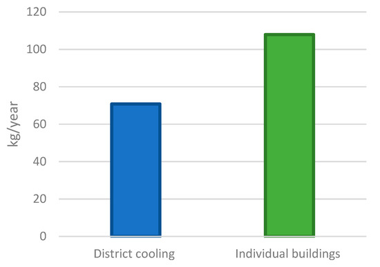 The refrigerant emissions (R14a) for both the DC system (water-cooled chillers) and individual buildings (air-cooled) are estimated as well. Figure 11 shows that by employing the DC system, the refrigerant emissions can be reduced approximately by 34% per year in comparison with refrigerant leakages in individual cooling systems.