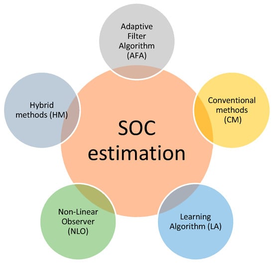 Currently, there have been multiple studies and attempts to develop and implement different methods to estimate/calculate SOC, and generally, they can be classified into five major categories (Figure 4):