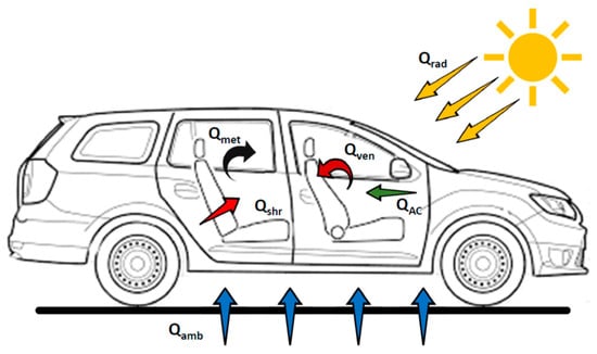 where Qtot is the total heat gain encountered by the cabin, Qven is the ventilation load, Qrad is the solar radiation load, Qamb is the ambient load, Qitl is the internal thermal load and QAC is the thermal load generated by the HVAC system. The internal thermal load (Qitl) considers the thermal load generated by the passengers’ bodies due to metabolic processes (55–85 W/m2 [34]) (Qmet) and the thermal load caused by the heat radiation of the inner surfaces from the passengers’ space (dashboard, door panels and the area, material and surface type of seats, etc.) (Qshr).