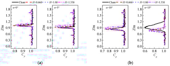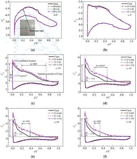 Figure 19 shows the static pressure coefficient (Cp) distribution on the airfoil surface at different angles of attack. The pressure taps are located on the pressure side of the two VGs, so the Cp curve will be prominently downward near the installation locations of the VGs. The Cp curves of the airfoil with and without VGs are similar to each other at 0° and 5° angles of attack, and there are no differences among the three VG heights. A pressure plateau appears on the Cp curve of the clean airfoil about 88H away from the installation position of the VGs when the angle of attack is 10°. The reverse pressure gradient of the clean airfoil is about −0.77 kpa/m; with the action of the VGs, the pressure plateau on the Cp curve for the airfoil with VGs disappears, and the Cp curves do not differ among the three VGs heights. With the increase in the angle of attack, the separation position of the clean airfoil is closer to the installation position of the VGs, and this configuration is beneficial to the control flow separation by the VGs when the angle of attack is 15°, 18°, and 20°. However, with the increase in the angle of attack, the reverse pressure gradient for the clean airfoil becomes progressively larger. Therefore, with the increase in the angle of attack, the VGs cannot completely inhibit the flow separation, although they can postpone it.