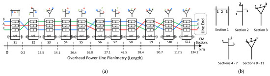 Electromagnetic modeling of the power line of interest: (a) Schematic of the equivalent line representation; (b) tower types found along the line for each section.