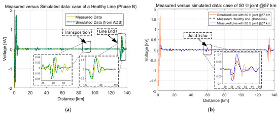 The implementation of the real TDR test bench and the measurement activities are reported in [21] and therefore are not repeated here. The effectiveness of this technique is shown by the agreement of the results obtained from a circuit simulation and the measured results as reported in Figure 2. Figure 2a shows the comparison for a line without any impedance anomaly (also named “healthy line”). Figure 2b shows the comparison for the same line where it is placed on a degraded joint with 50 impedance at the 57th km. A good agreement between the modeling and measurement is obtained.