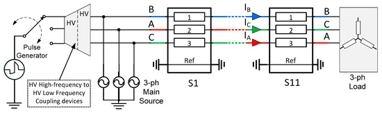 To develop both the aforementioned high-voltage coupling strategy and the post-processing algorithm, proper modeling of the IS line scenario must first be built. For the sake of simplicity, without a loss of generality, here, the study can be reduced to only one representative phase of the power grid. In this case, the developed representation is shown by the schematic representation depicted in Figure 4.