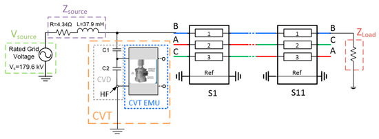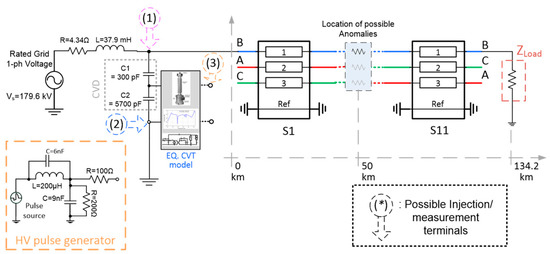 In this case study, we implicitly assume that no power line communication (PLC) equipment is mounted on the specific line phase of interest. Thus, the presence of other ancillary apparatus that can affect the results coming from the application of the TDR strategy can be neglected, such as, for instance, the coupling unit used for PLC applications that is usually attached to the HF terminal of CVTs, marked with “HF” in Figure 4. Normally, the HF terminal is grounded if it is not being used. For the same reasons, no line traps are accounted for in this particular application study.