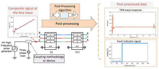 All aspects regarding the high-frequency characterization of the CVT for the injection of the TDR test pulse are given in Section 3.1. Then, a proper post-processing algorithm is introduced to make the resulting data useful for the detection of defects.