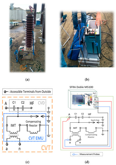 Details of the SFRA measurement campaign to experimentally characterize a CVT: (a), Picture of the CVT under test inside a secure substation bay (b), Doble M5100 SFRA instrument (c), CVT functional diagram, (d) test connections realized for the CVT frequency analysis.