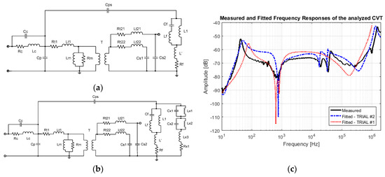 Equivalent circuit models used for the characterization of the CVT of interest: (a) Trial#1, (b) Trial#2, and (c) agreement of their responses with respect to the measured CVT SFRA spectrum.